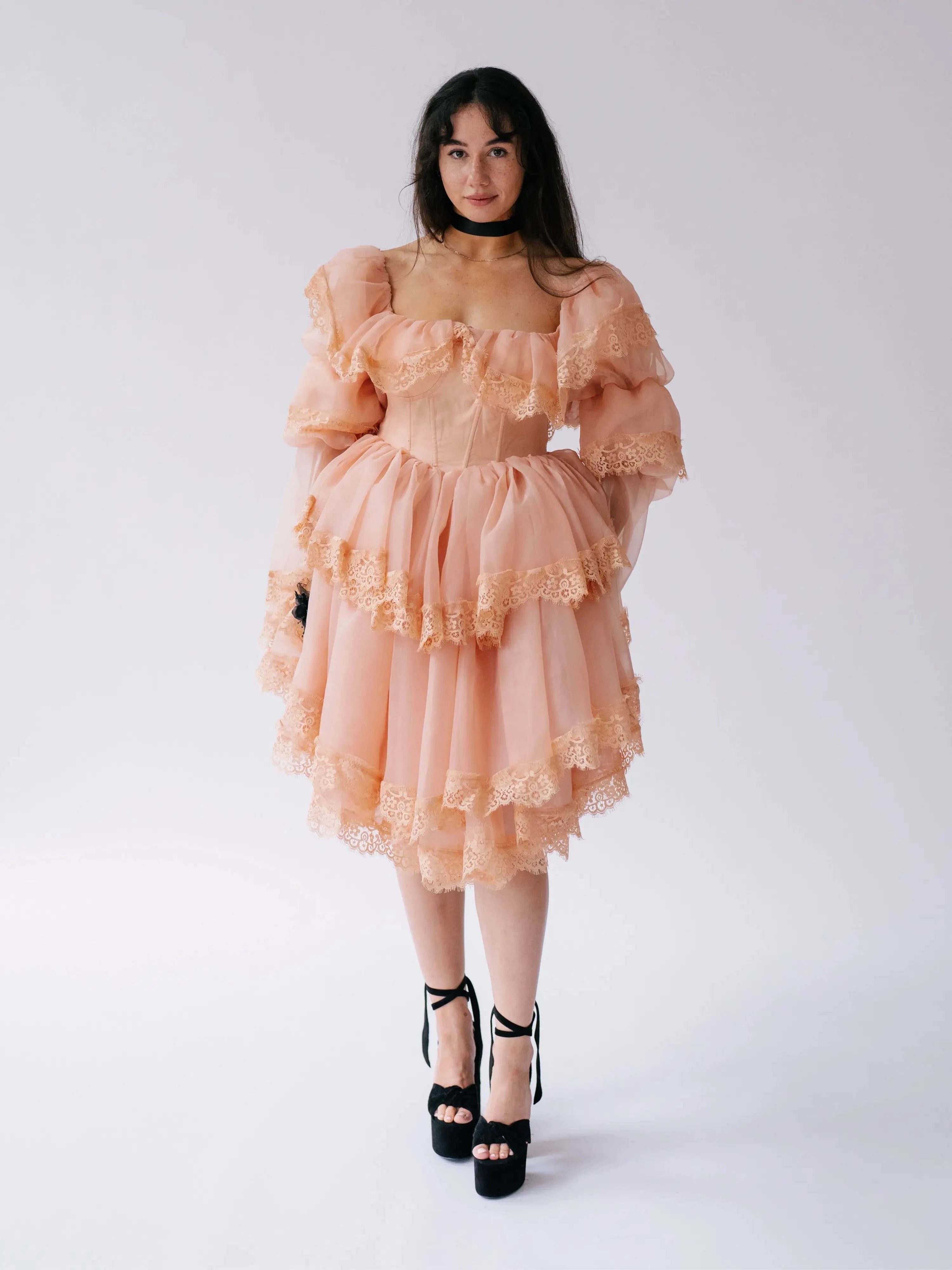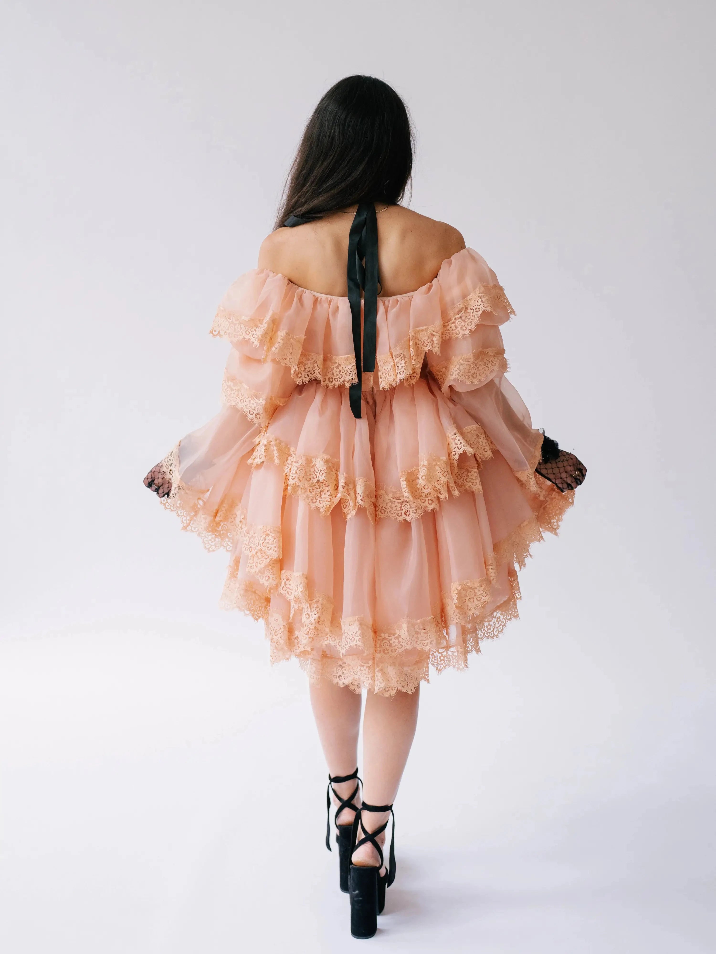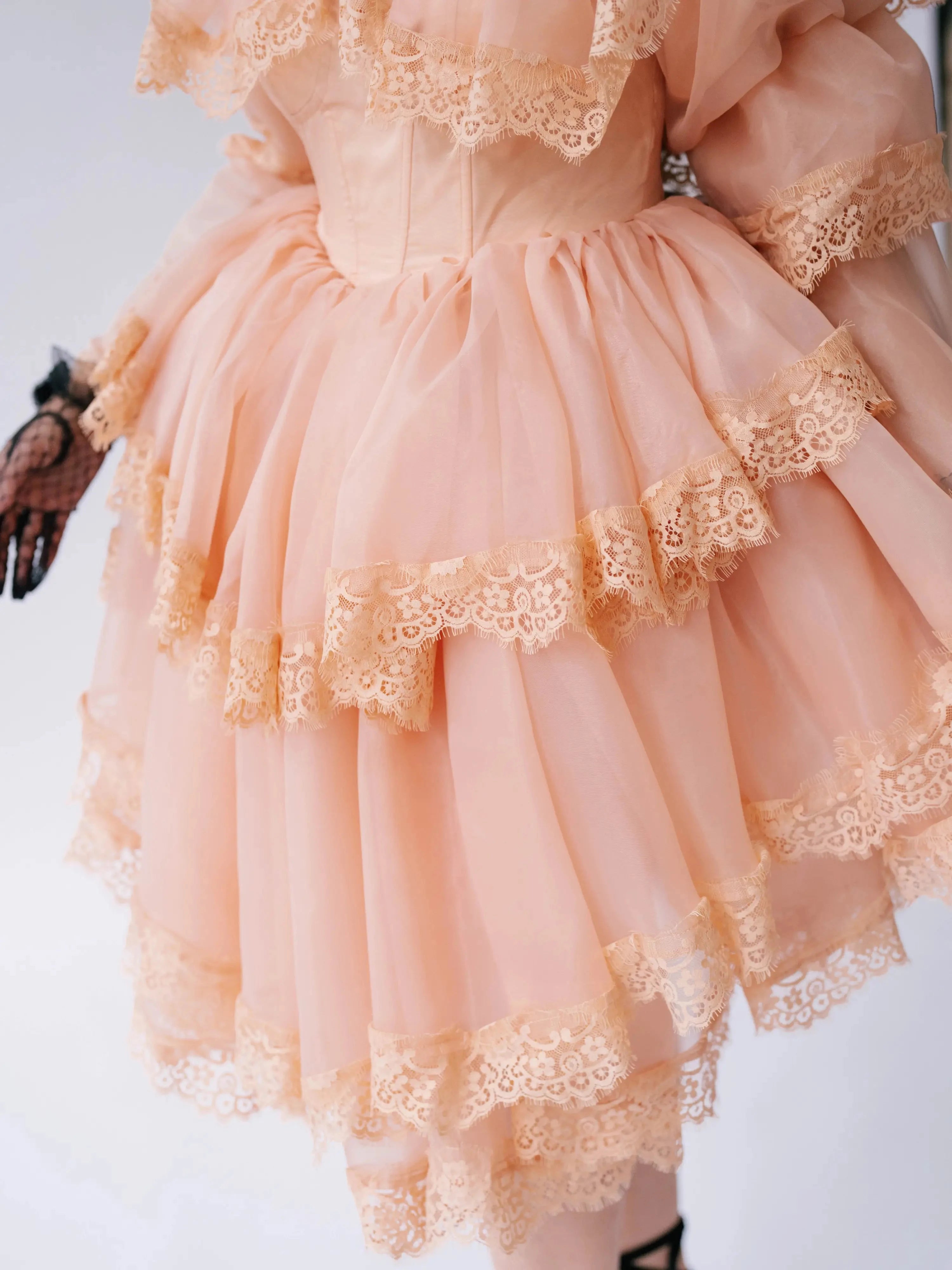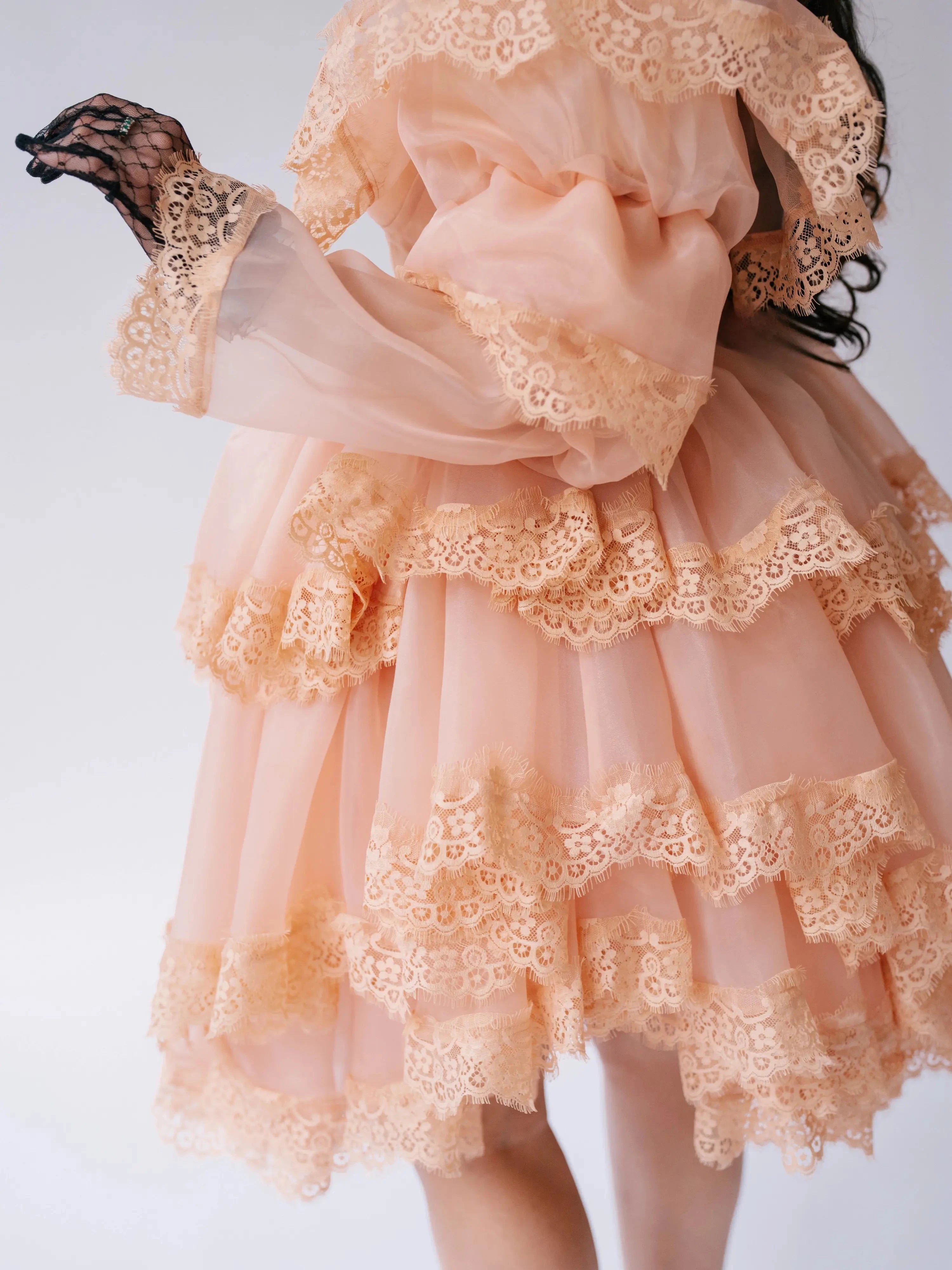 Close-up of tiered lace ruffles on the Midnight Symphony Organza Mini Dress highlighting delicate craftsmanship and soft pumpkin milk organza fabric.