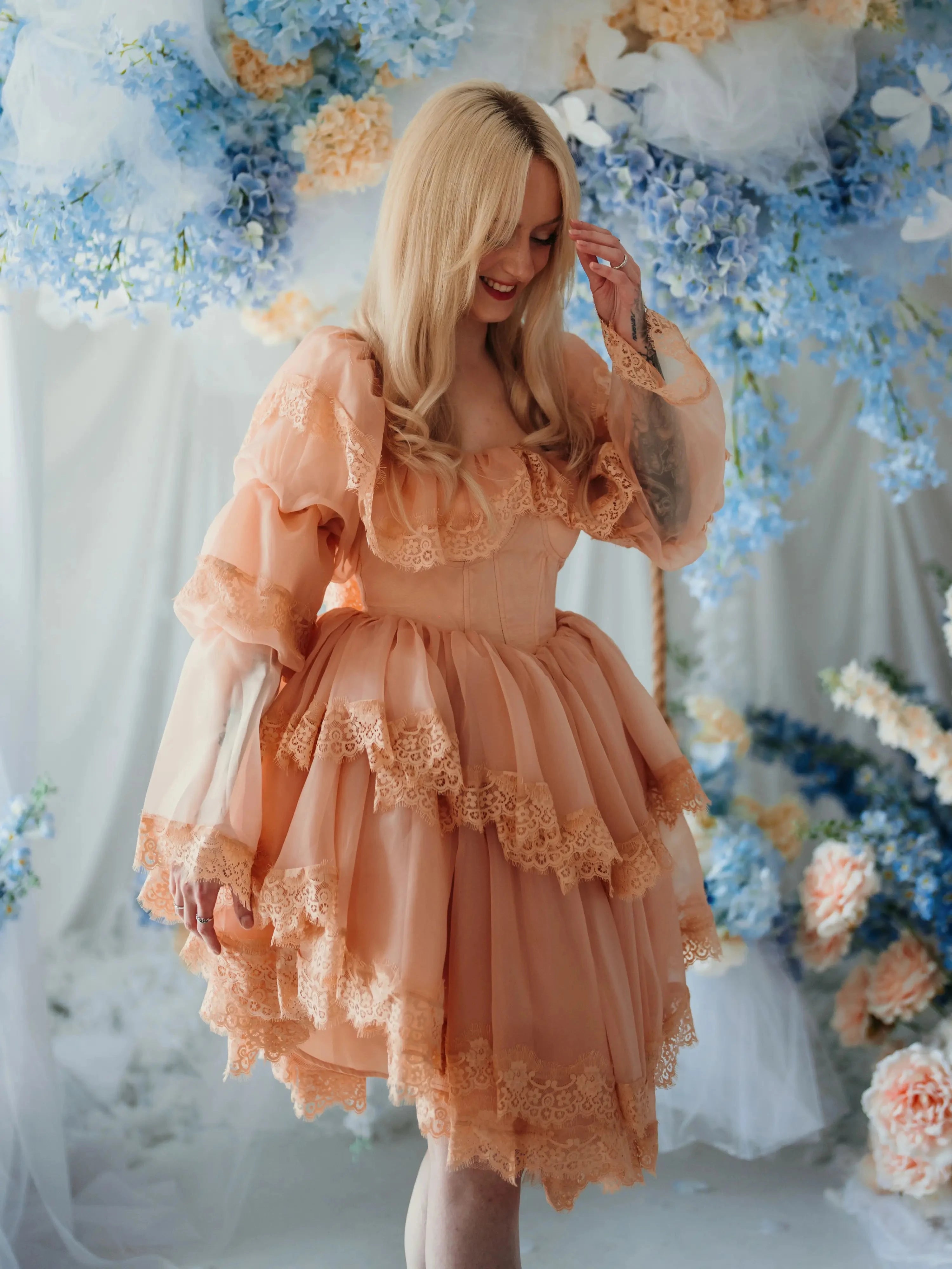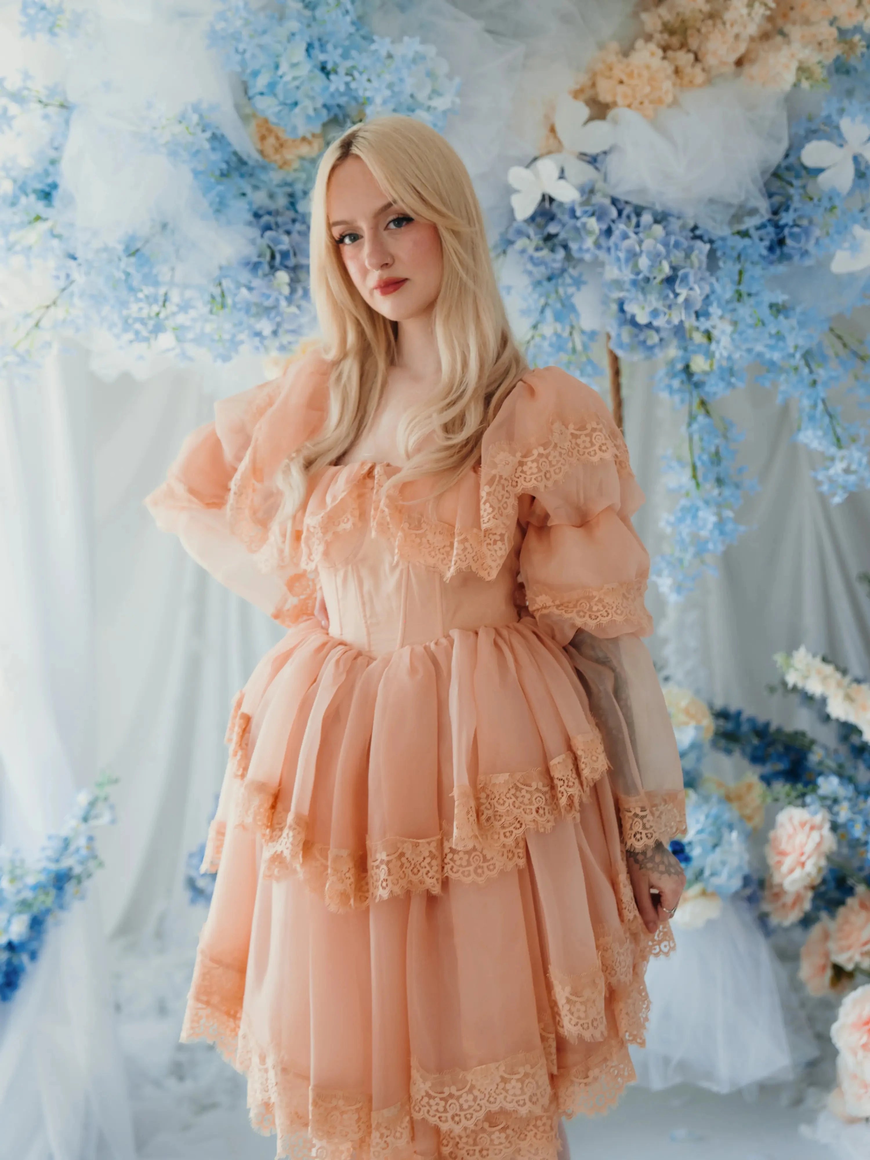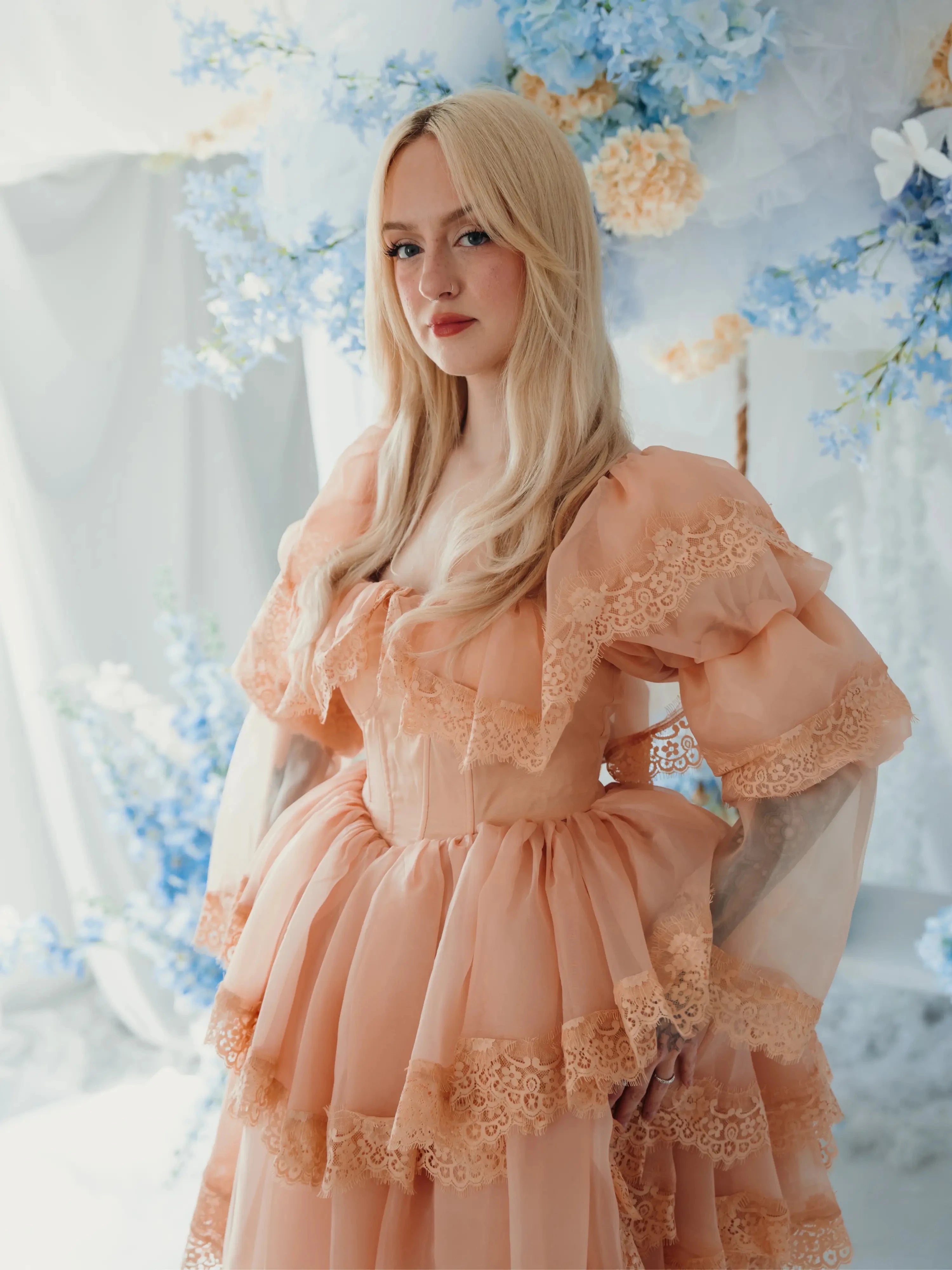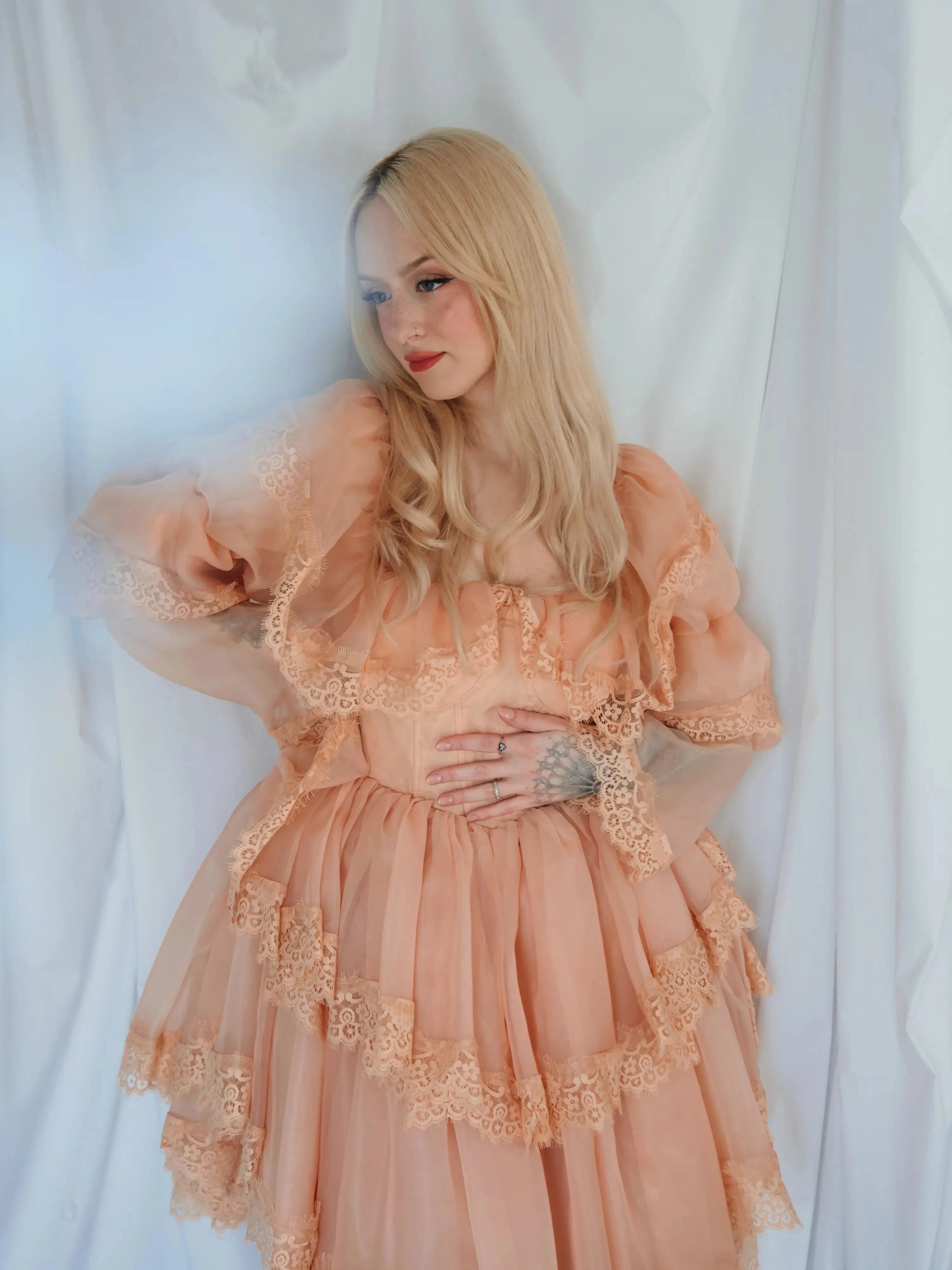 Every detail carries intention, layers of custom hand-dyed organza in a pumpkin milk color, trimmed in custom lace, supported by hidden tulle, crinoline, and soft lining for volume that ebbs and flows. The structured bodice with boning and built-in cups gives shape and strength, while tiered sleeves and ruffled overlays soften the silhouette. The gown is finished with a bridal zipper and hook closure, preserving its heirloom spirit while offering ease of wear.