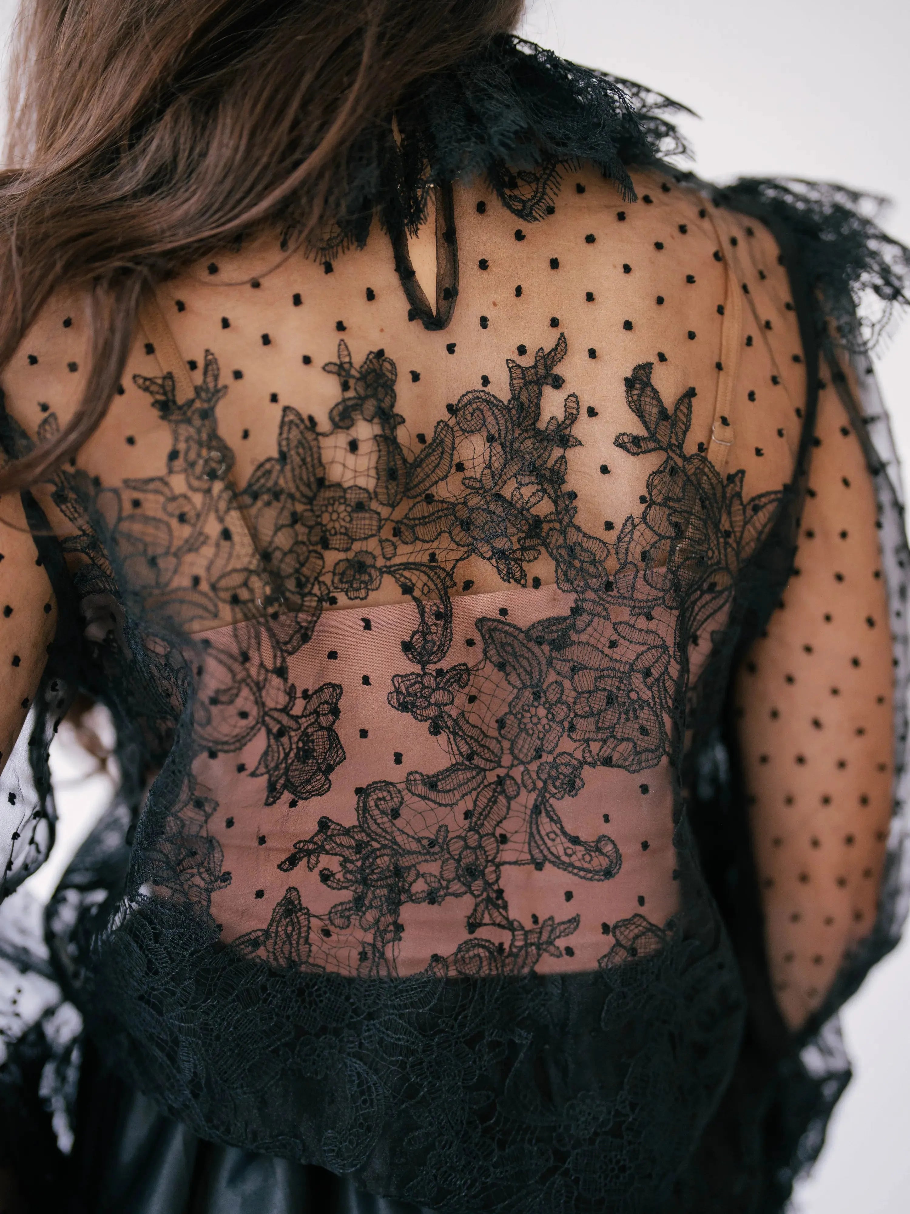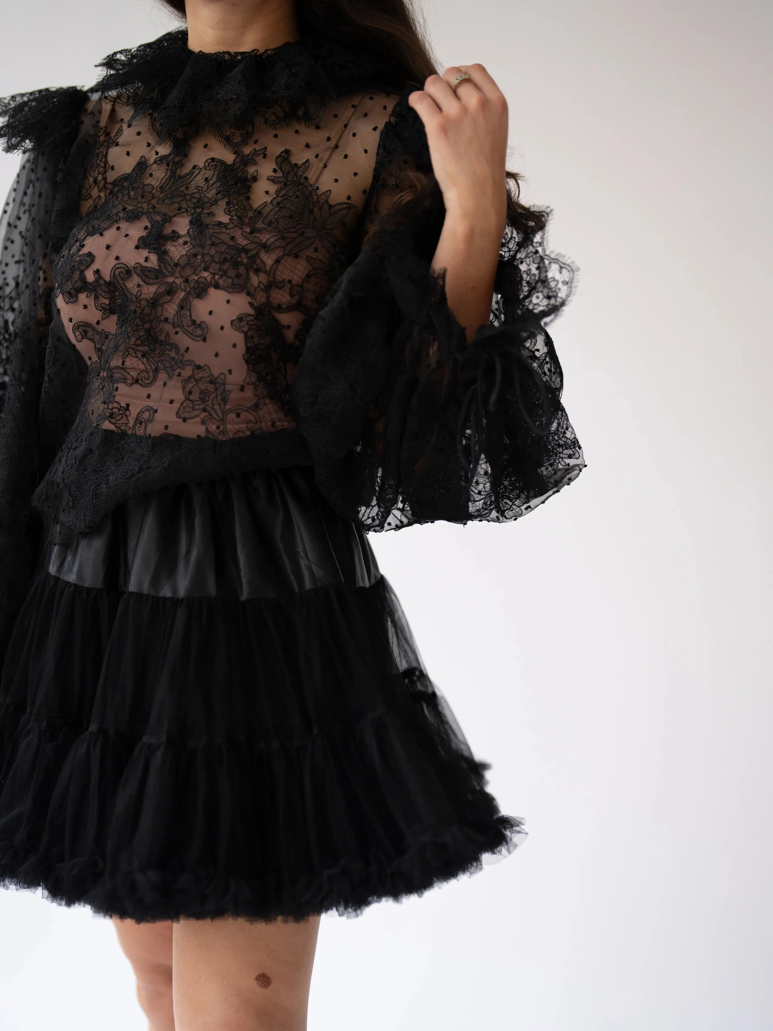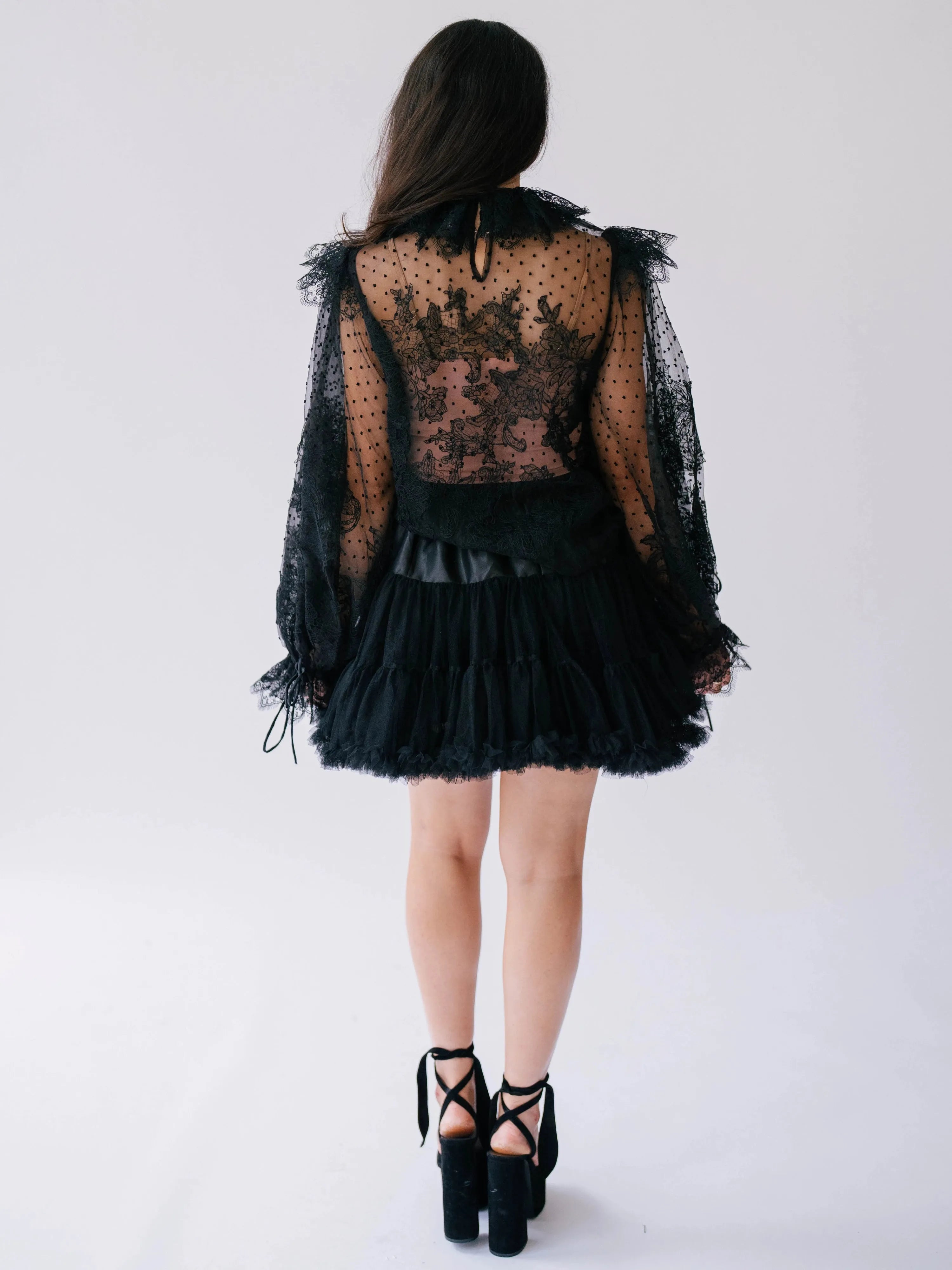 Every stich has a story to tell, this black lace top is crafted from fine poly mesh and adorned with hand-sewn lace appliques across it's sheer lace fabric. The puff sleeves gather into lace cuffs with drawstrings that you can cinch. This piece also features a ruffled collar and a soft keyhole closure.