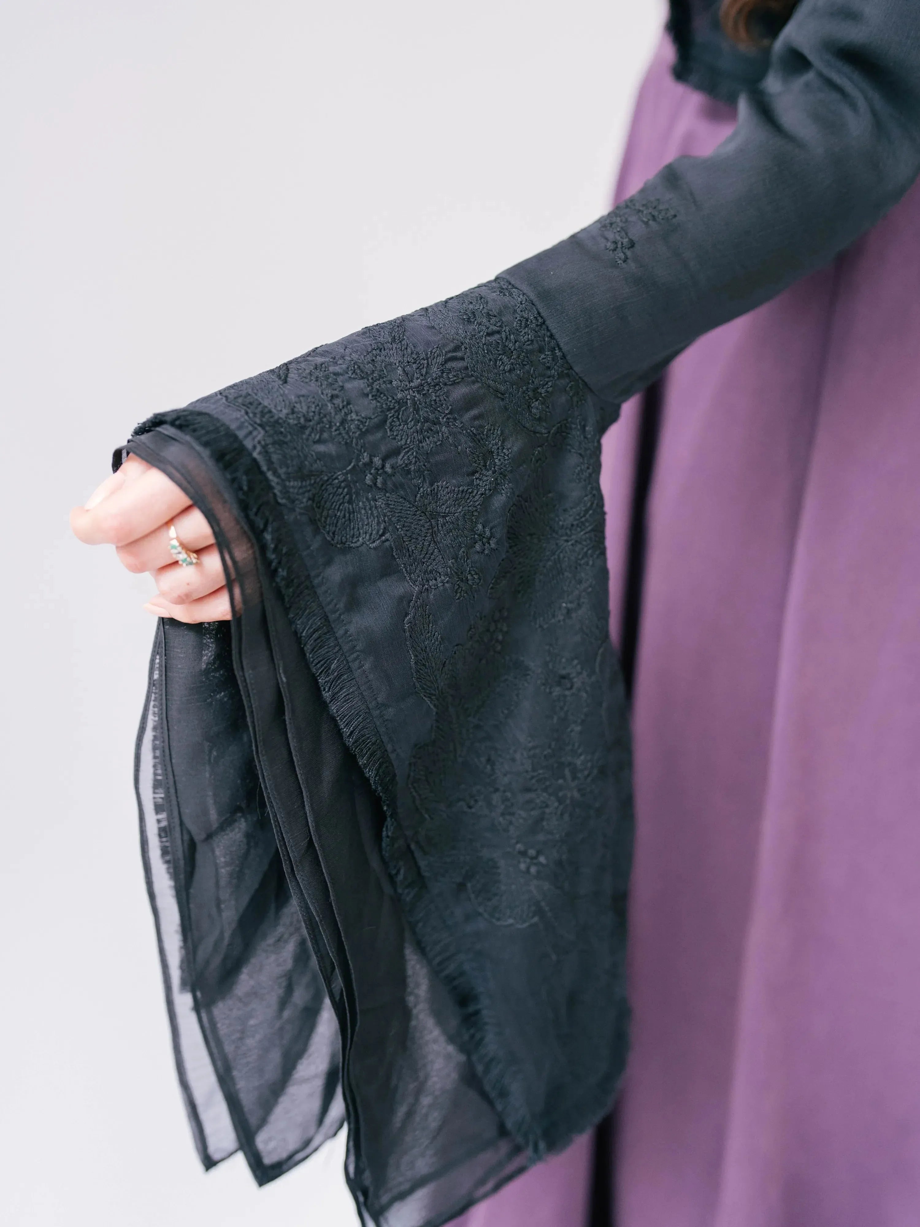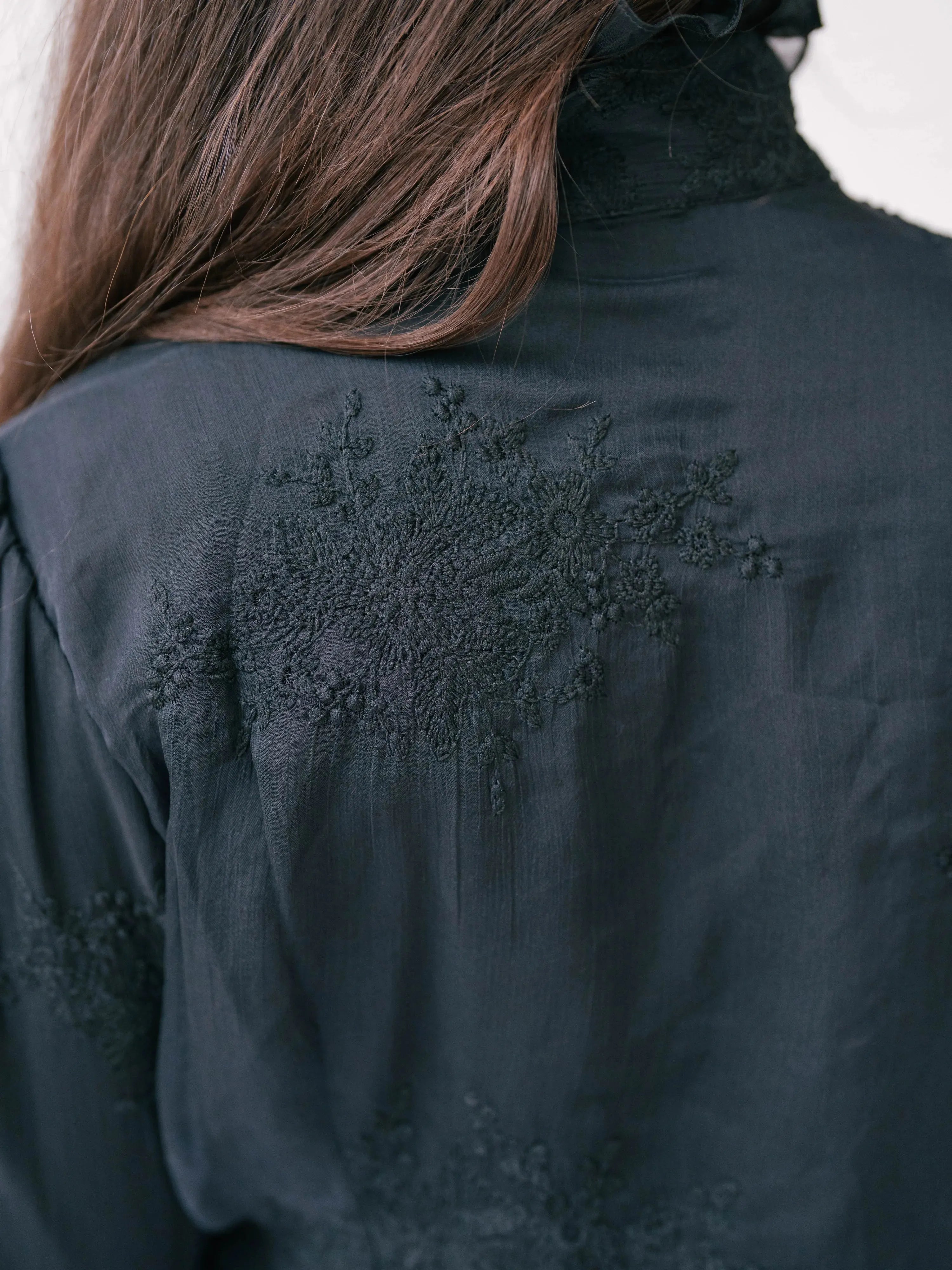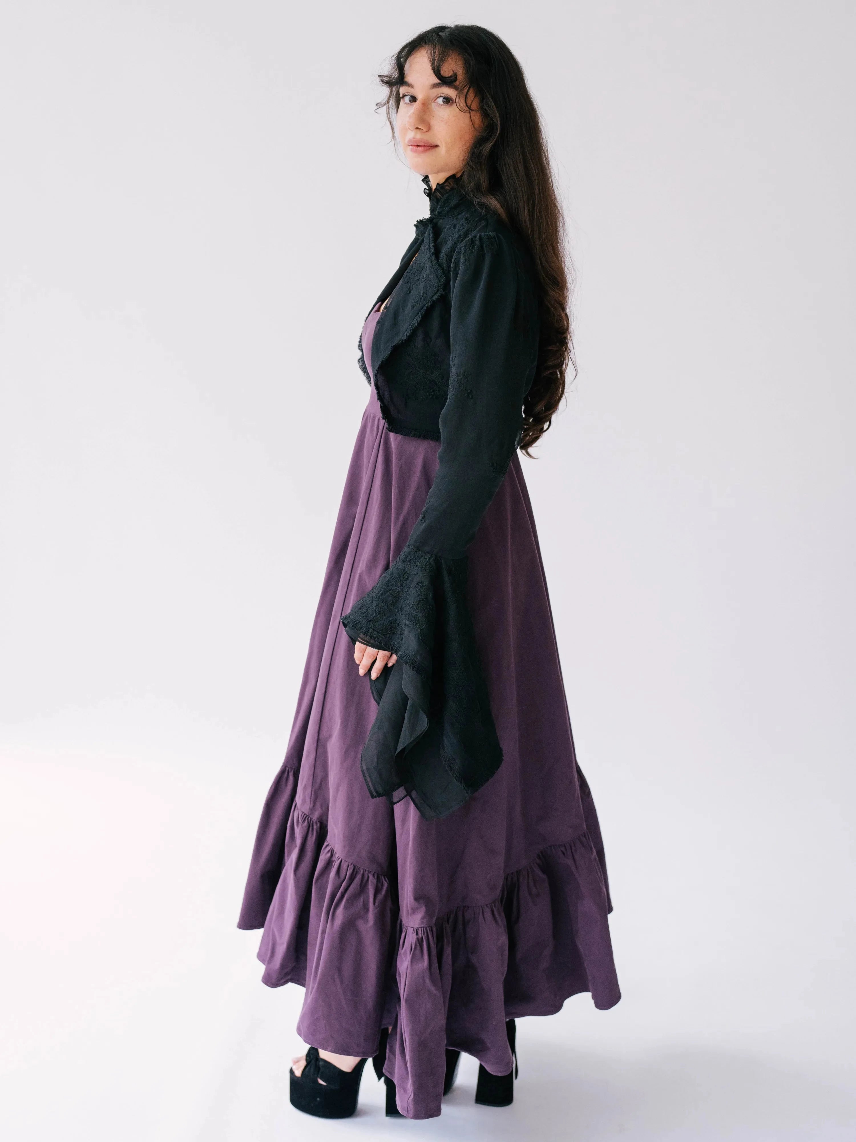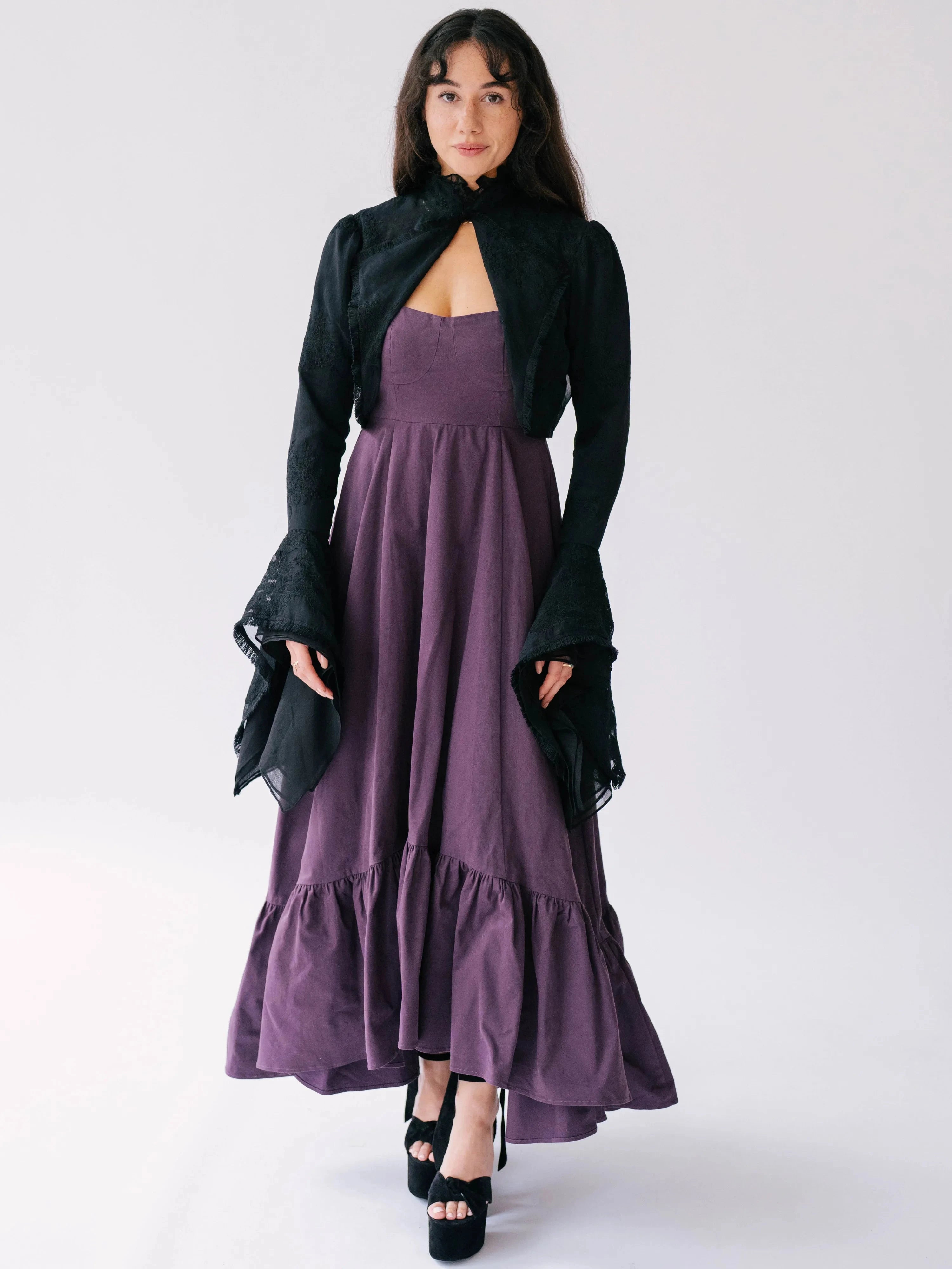 Crafted from delicate lace, each piece is hand-dyed black and finished with meticulously placed appliqués that are carefully hand-sewn. This allows the jacket's texture to come alive. The handkerchief bell sleeves billow with layered fabric, falling in gothic fairytales that transform even the simplest dress into something extraordinary. The ruffle-trimmed collar frames the neckline, while fabric button closures and subtle fringe edges ground the piece in craftsmanship, making it heirloom-worthy.