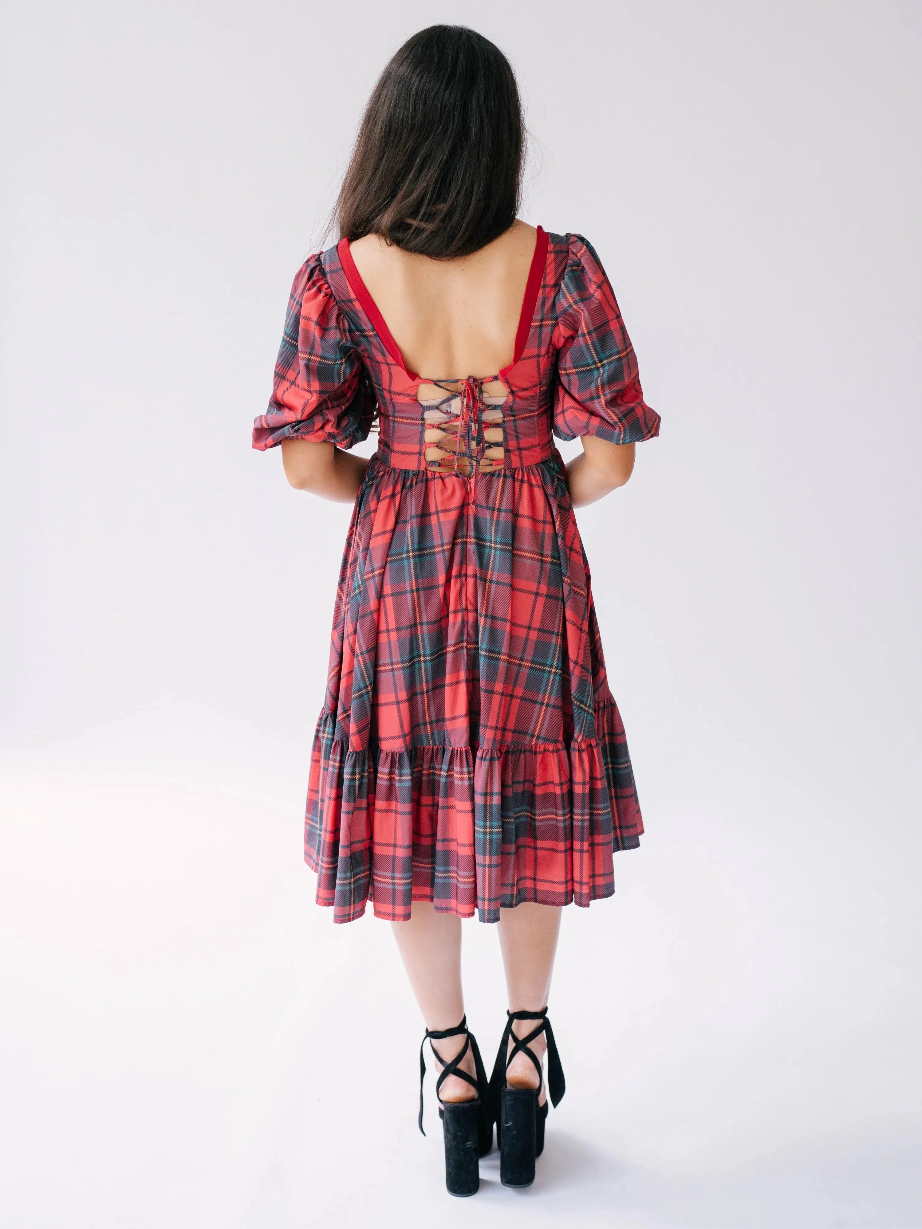 Born from our signature Josephine Renaissance Gown, the Josephine Tartan Plaid Dress brings a vintage, cozy charm to our modern holiday season. This tartan plaid dress is crafted from soft taffeta with a structured bodice that's soft to the touch. It features boning and a functional corset back laced with rich red ribbon. The custom plaid print captures the hues of winter festivities, while its midi length makes it wearable anytime, not just for the holidays. The Josephine Tartan Plaid Dress was born to capture the Christmas spirit of the Victorian era, one of candlelight, ribbons, and a touch of nostalgia.
