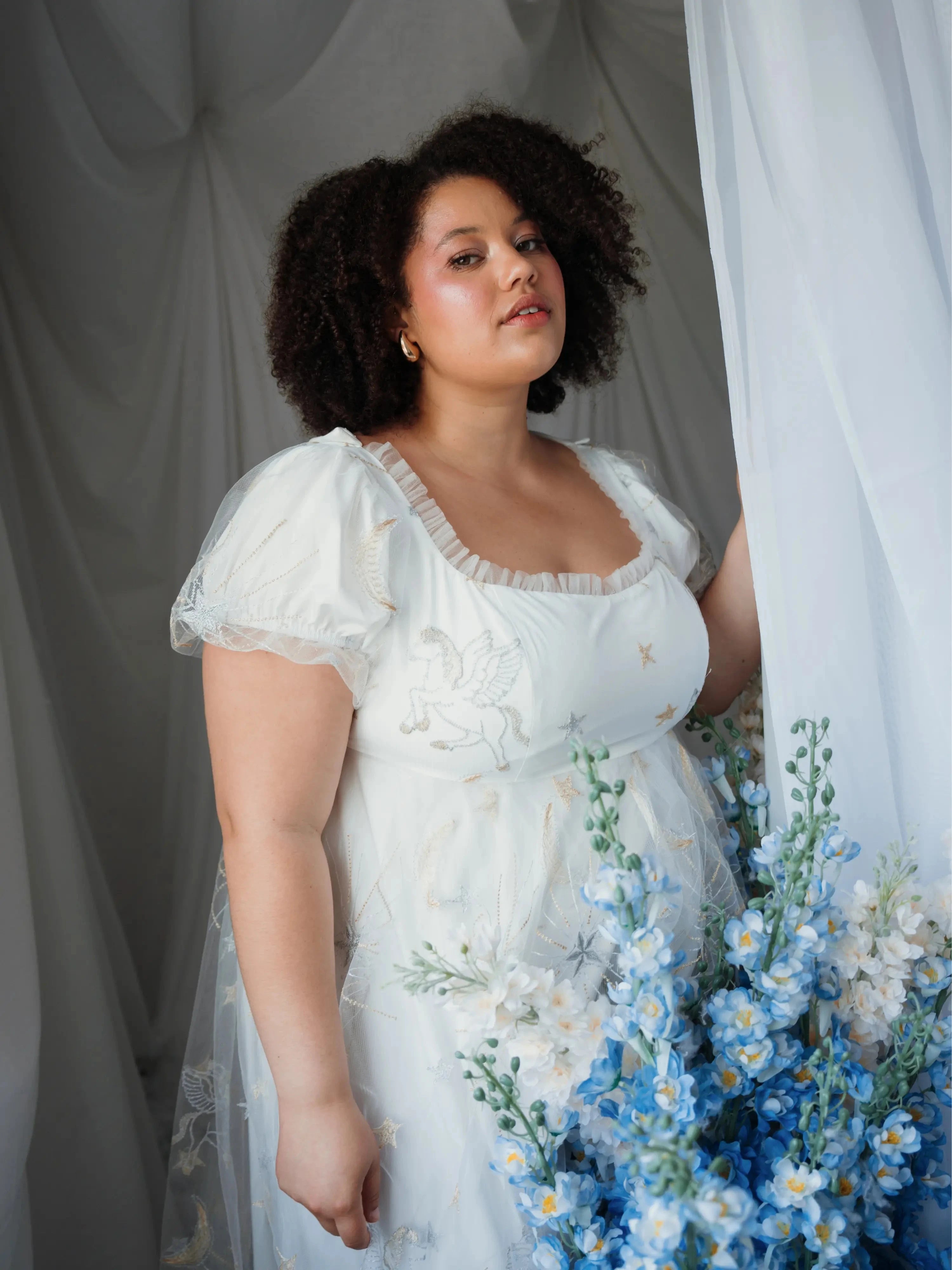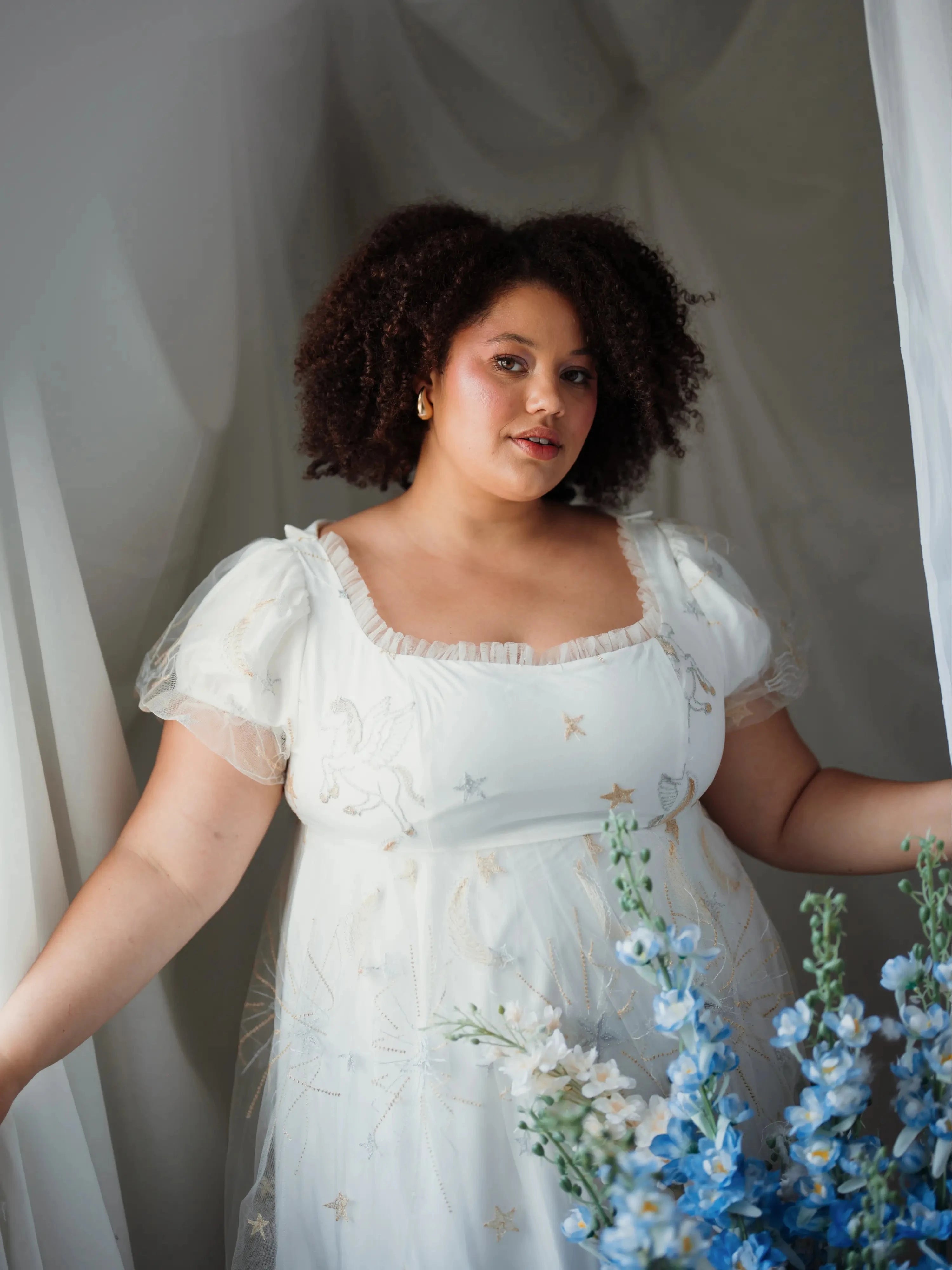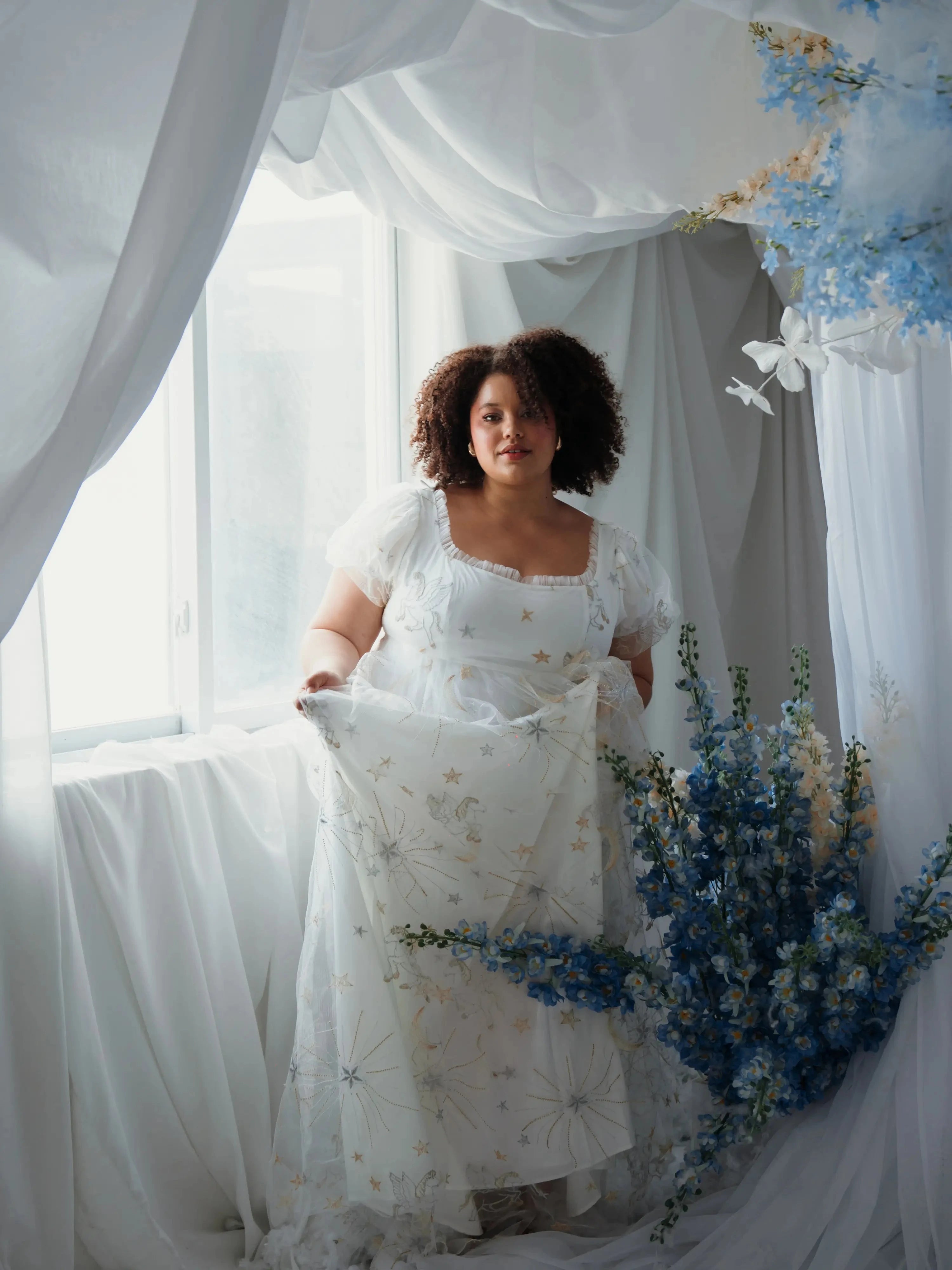 Inspirée de l'élégance de Bridgerton, la robe en dentelle Dauphine Voile Céleste est un rêve devenu réalité pour les collectionneuses de robes et les passionnées de célestes. Confectionnée en dentelle délicate, brodée de lunes et d'étoiles en or et en argent, cette robe en dentelle donne vie à une touche de cosmos.