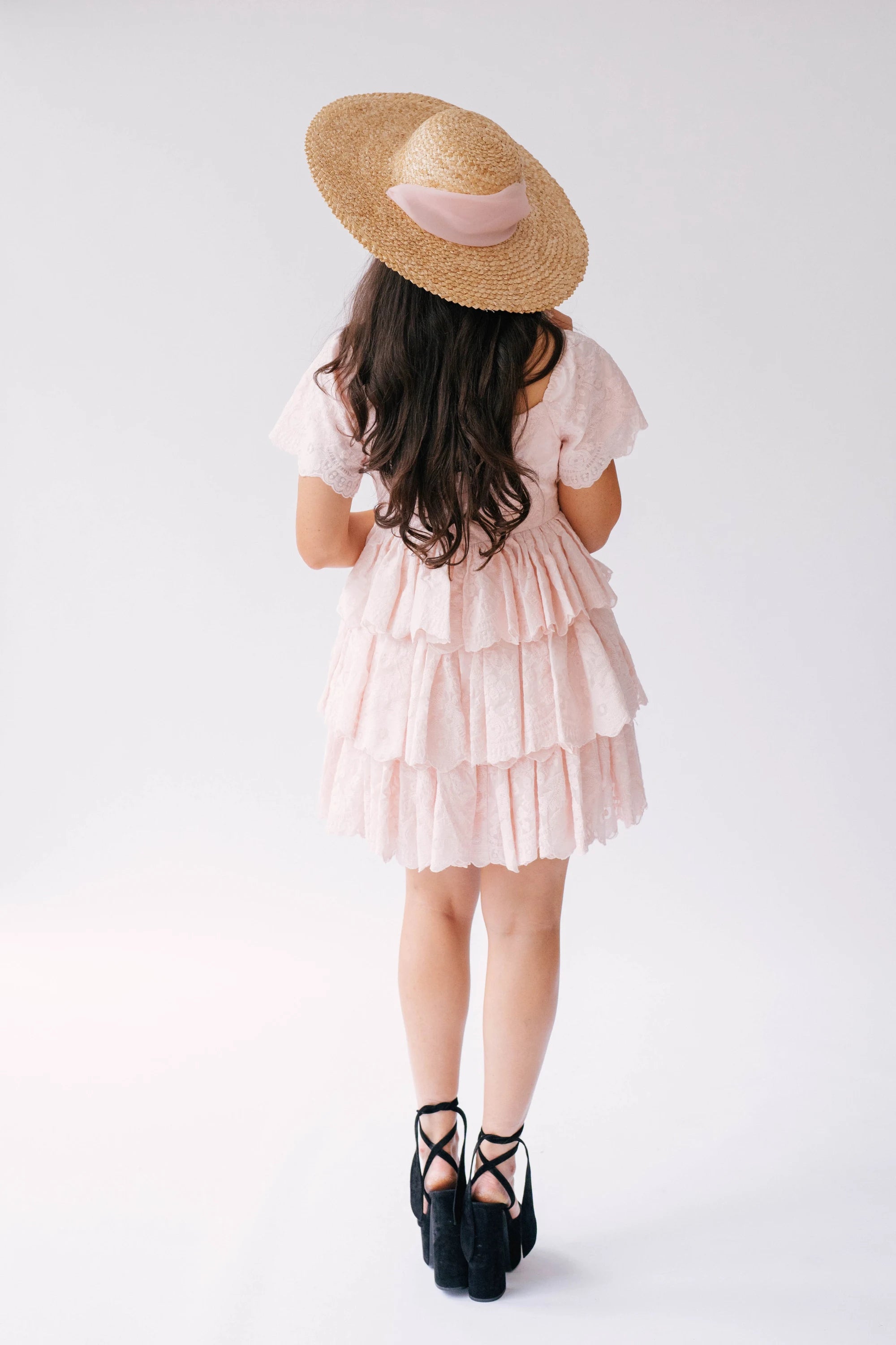 A woman wearing a pink cotton dress with a straw hat on a white background.