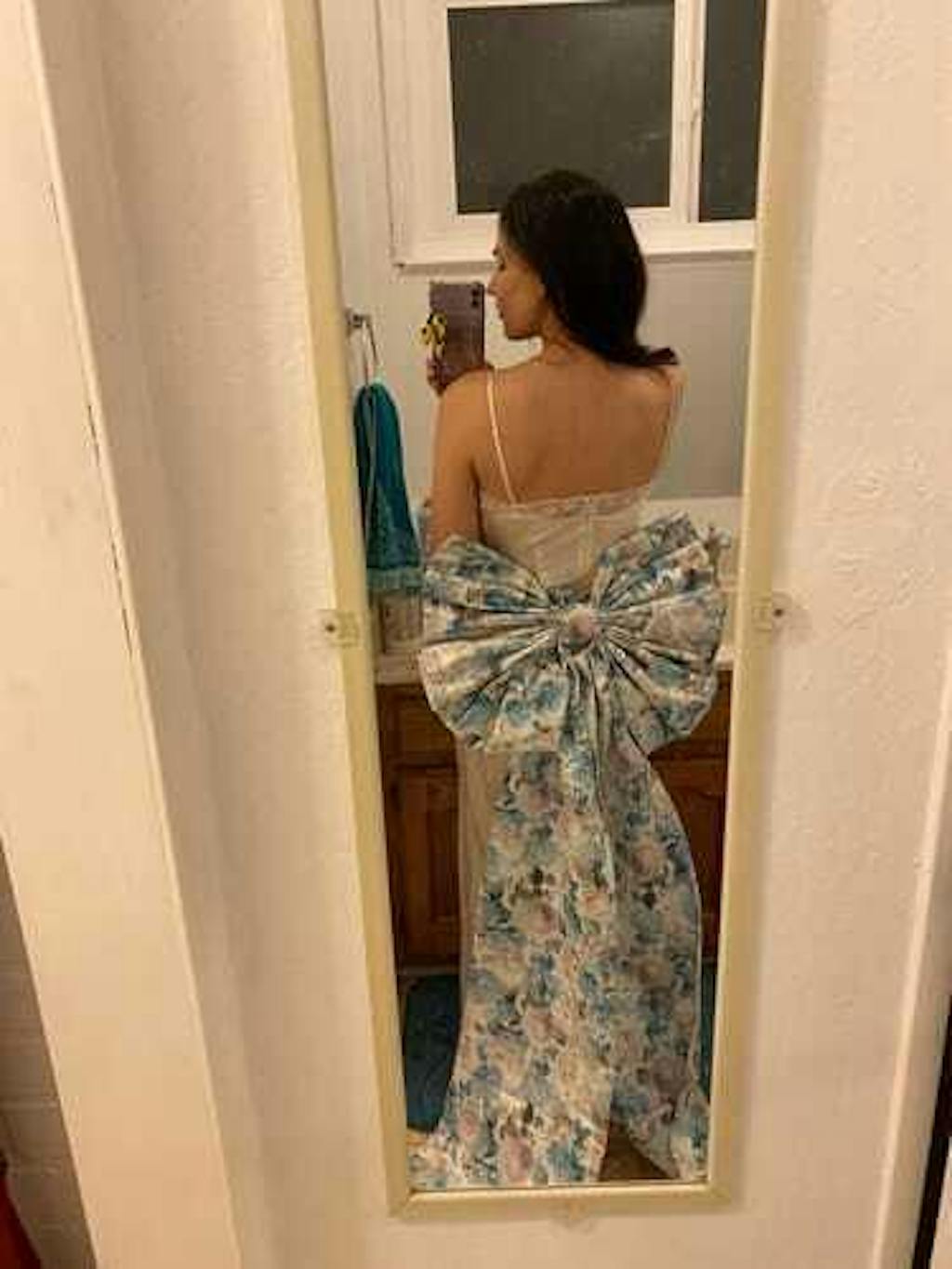 This bow is truly everything! It’s so big and bold in person (for context I wear between XXS and XS in Ivory Sheep with hips on the bigger side of that scale and it’s giving anime magical girl on me). It feels very solid and sturdy, like it will hold up to some extended wear. The color is also gorgeous, a white/ivory base with plenty of soft floral colors to choose from to coordinate with.